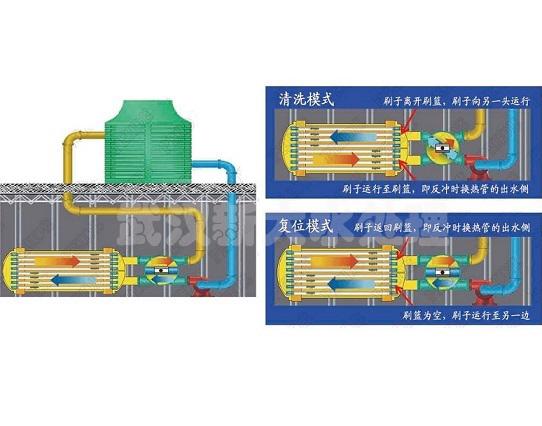 該系統(tǒng)由管刷,刷籃,四通換向閥和控制系統(tǒng)組成。管刷,刷籃裝于冷水機(jī)組換熱器上,四通換向閥安裝于水路。換向閥工作時進(jìn)行水流方向的切換,使換熱器內(nèi)部的水流方向發(fā)生改變,從而推動管刷往復(fù)運(yùn)動清洗管壁,任何堅(jiān)韌的污垢都還在柔軟的狀態(tài)時被及時清除。系統(tǒng)不工作時,刷子位于刷籃內(nèi),處于靜止?fàn)顟B(tài)。系統(tǒng)的清洗次數(shù)依照當(dāng)?shù)氐墓r決定,一般建議每四小時清洗一次。